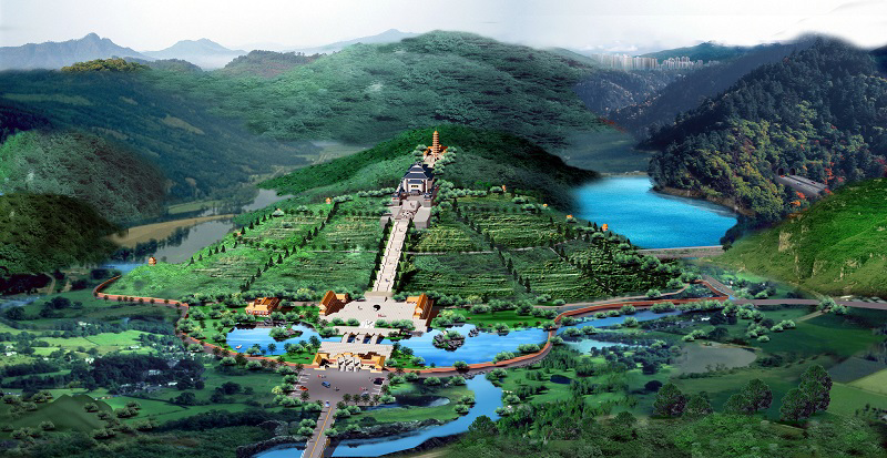 龙台山陵园的规划源用中国传统皇陵的中轴线布局方案,气势宏大;又辅以“金水玉带”典型风水格局。陵园“依山傍水、藏风聚气”,达到了自然美与人文美的有机结合,达到了慎终,天人合一的崇高境界。陵园建设“形来势止,前亲后倚”,丰富了陵园的整体感与景观层次;显示了传统为主、多元并蓄的文化特点。陵园根据功能分为:入口区、接待区、祭祀区、地墓区、堂塔区、园林水体等。